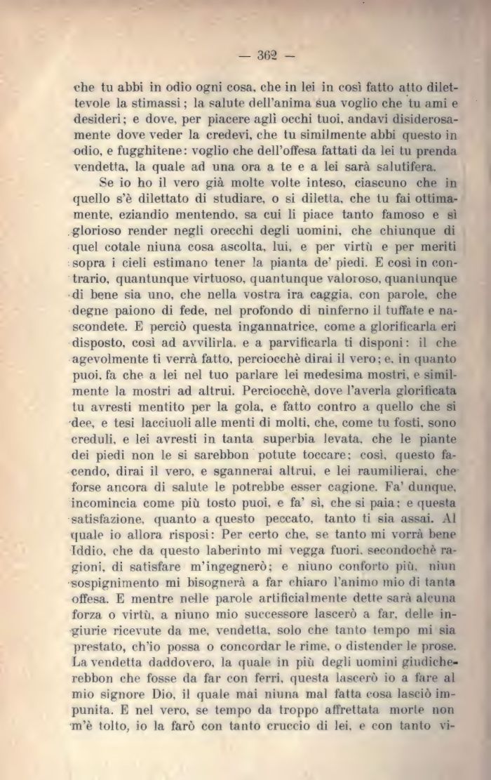Se io ho il vero già molte volte inteso, ciascuno che in quello s'è dilettato di studiare, o si diletta, che tu fai ottimamente, eziandio mentendo, sa cui li piace tanto famoso e sì glorioso render negli orecchi degli uomini, che chiunque di quel cotale niuna cosa ascolta, lui. e per virtù e per meriti sopra i cieli estimano tener la pianta de' piedi. E così in contrario, quantunque virtuoso, quantunque valoroso, quantunque di bene sia uno, che nella vostra ira caggia, con parole, che degne paiono di fede, nel profondo di ninferno il tuffate e nascondete. E perciò questa ingannatrice, come a glorificarla eri disposto, così ad avvilirla, e a parvificarla ti disponi: il che agevolmente ti verrà fatto, perciocché, dirai il vero; e. in quanto puoi, fa che a lei nel tuo parlare lei medesima mostri, e similmente la mostri ad altrui. Perciocché, dove l'averla glorificata tu avresti mentito per la gola, e fatto contro a quello che si •dee, e tesi lacciuoli alle menti di molti, che, come tu fosti, sono creduli, e lei avresti in tanta superbia levata, che le piante dei piedi non le si sarebbon potute toccare; così, questo facendo, dirai il vero, e sgannerai altrui, e lei raumilierai, che forse ancora di salute le potrebbe esser cagione. Fa' dunque, incomincia come più tosto puoi, e fa' sì, che si paia: e questa satisfazione, quanto a questo peccato, tanto ti sia assai. Al quale io allora risposi: Per certo che, se. tanto mi vorrà bene Iddio, che da questo laberinto mi vegga fuori, seeondochè ragioni, di satisfare m'ingegnerò; e niuno conforto più. niun sospignimento mi bisognerà a far chiaro l'animo mio di tanta offesa. E mentre nelle parole artificialmente dette sarà alcuna forza o virtù, a niuno mio successore lascerò a far, delle ingiurie ricevute da me, vendetta, solo che tanto tempo mi sia prestato, ch'io possa o concordar le rime, o distender le prose. La vendetta daddovero, la quale in più degli uomini giudiche-rebbon che fosse da far con ferri, questa lascerò io a fare al mio signore Dio, il quale mai ninna mal fatta cosa lasciò impunita. E nel vero, se tempo da troppo affrettata morte non m'è tolto, io la farò con tanto cruccio di lei. e con tanto vi-
