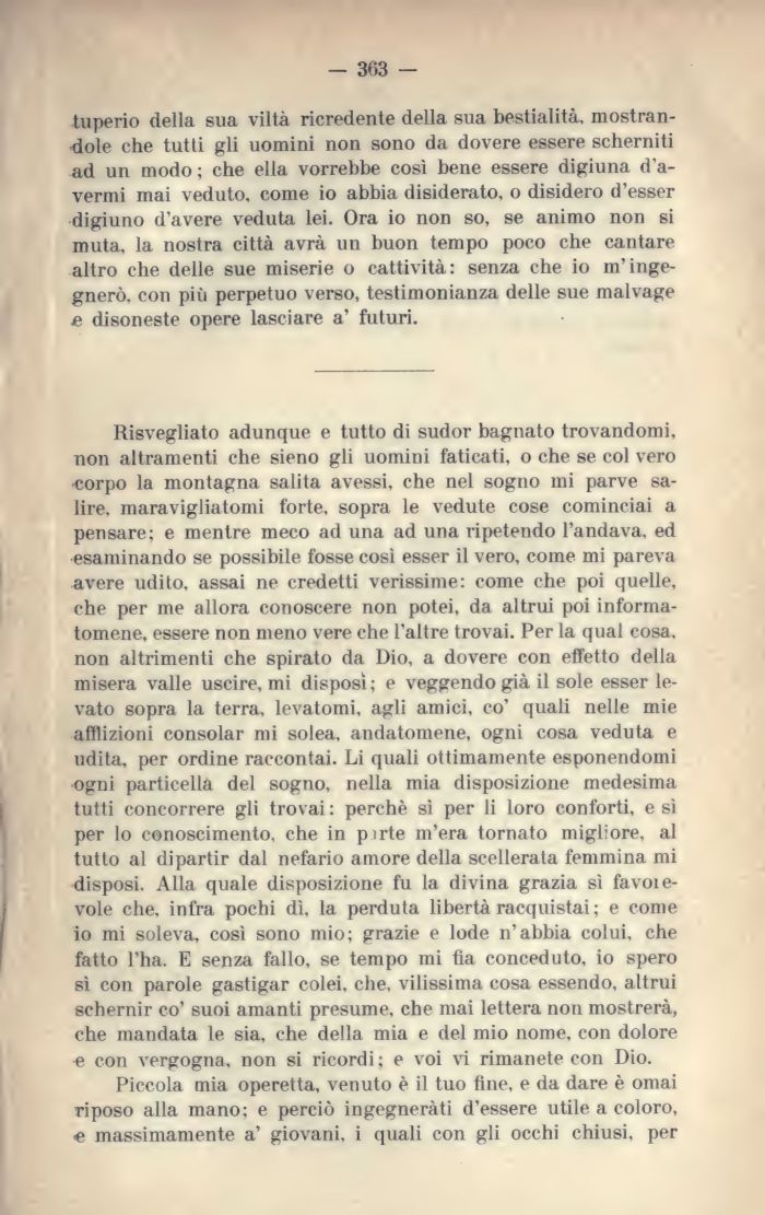 Risvegliato adunque e tutto di sudor bagnato trovandomi, non altramenti che sieno gli uomini faticati, o che se col vero ¦corpo la montagna salita avessi, che nel sogno mi parve salire. maravigliatomi forte, sopra le vedute cose cominciai a pensare; e mentre meco ad una ad una ripetendo l'andava, ed esaminando se possibile fosse così esser il vero, come mi pareva avere udito, assai ne credetti verissime: come che poi quelle, che per me allora conoscere non potei, da altrui poi informatomene, essere non meno vere che l'altre trovai. Per la qual cosa, non altrimenti che spirato da Dio, a dovere con effetto della misera valle uscire, mi disposi ; e veggendo già il sole esser levato sopra la terra, levatomi, agli amici, co' quali nelle mie afflizioni consolar mi solea, andatomene, ogni cosa veduta e udita, per ordine raccontai. Li quali ottimamente esponendomi ogni particella del sogno, nella mia disposizione medesima tutti concorrere gli trovai : perchè sì per li loro conforti, e sì per lo conoscimento, che in pirte m'era tornato migliore, al tutto al dipartir dal nefario amore della scellerata femmina mi disposi. Alla quale disposizione fu la divina grazia sì favoie-vole che, infra pochi dì. la perduta libertà racquistai; e come io mi soleva, così sono mio; grazie e lode n'abbia colui, che fatto l'ha. E senza fallo, se tempo mi fìa conceduto, io spero sì con parole gastigar colei, che, vilissima cosa essendo, altrui schernir co' suoi amanti presume, che mai lettera non mostrerà, che mandata le sia, che della mia e del mio nome, con dolore e con vergogna, non si ricordi ; e voi vi rimanete con Dio.