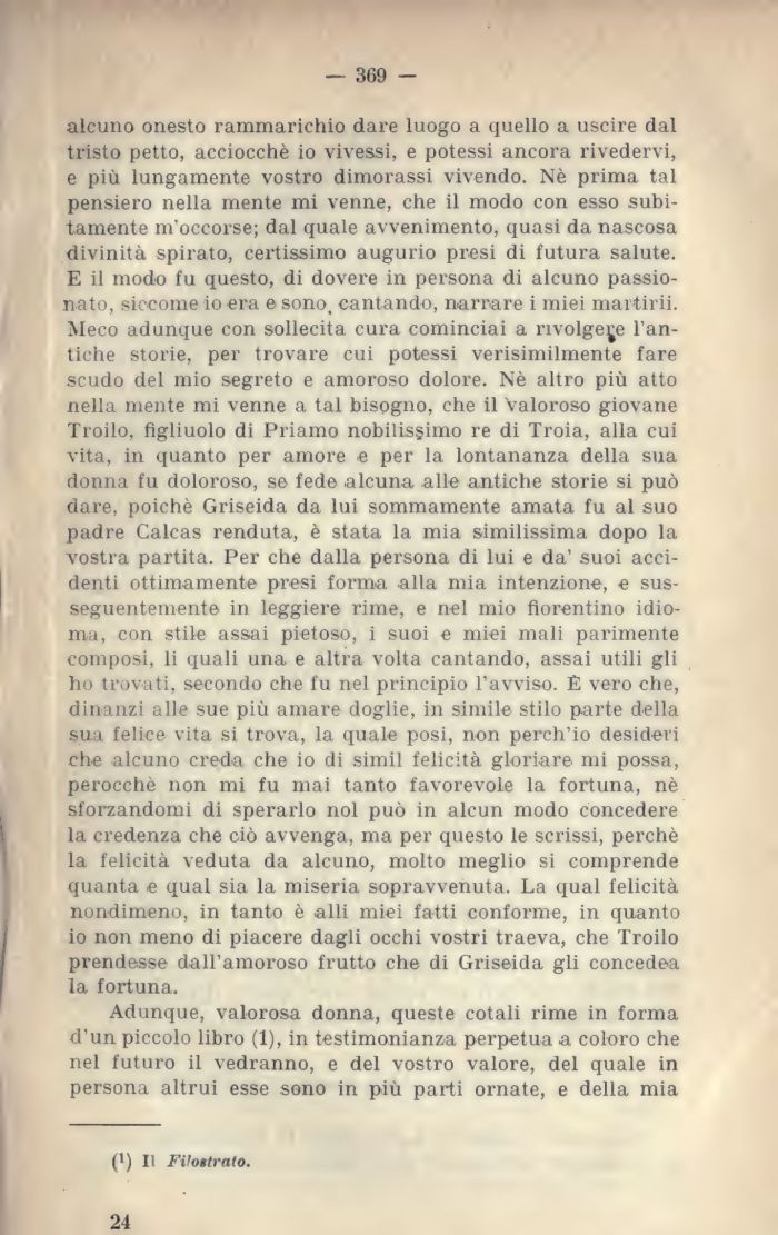 alcuno onesto rammarichio dare luogo a quello a uscire dal tristo petto, acciocché io vivessi, e potessi ancora rivedervi, e più lungamente vostro dimorassi vivendo. Nè prima tal pensiero nella mente mi venne, che il modo con esso subitamente m'occorse; dal quale avvenimento, quasi da nascosa divinità spirato, certissimo augurio presi di futura salute. E il modo fu questo, di dovere in persona di alcuno passionato, siccome io era e sono, cantando, narrare i miei martirii. Meco adunque con sollecita cura cominciai a rivolgere l'antiche storie, per trovare cui potessi verisimilmente fare scudo del mio segreto e amoroso dolore. Nè altro più atto nella mente mi venne a tal bisogno, che il Valoroso giovane Troilo, figliuolo di Priamo nobilissimo re di Troia, alla cui vita, in quanto per amore e per la lontananza della sua donna fu doloroso, se fede alcuna alle antiche storie si può dare, poiché Griseida da lui sommamente amata fu al suo padre Calcas renduta, è stata la mia similissima dopo la vostra partita. Per che dalla persona di lui e da' suoi accidenti ottimamente presi forma alla mia intenzione, e sus-seguenteniente in leggiere rime, e nel mio fiorentino idioma, con stile assai pietoso, i suoi e miei mali parimente composi, li quali una e altra volta cantando, assai utili gli ho trovati, secondo che fu nel principio l'avviso. È vero che, dinanzi alle sue più amare doglie, in simile stilo parte della sua felice vita si trova, la quale posi, non perch'io desideri che alcuno creda che io di simil felicità gloriare mi possa, perocché non mi fu mai tanto favorevole la fortuna, nè sforzandomi di sperarlo noi può in alcun modo concedere la credenza che ciò avvenga, ma per questo le scrissi, perchè la felicità veduta da alcuno, molto meglio si comprende quanta e qual sia la miseria sopravvenuta. La qual felicità nondimeno, in tanto è alli miei fatti conforme, in quanto io non meno di piacere dagli occhi vostri traeva, che Troilo prendesse dall'amoroso frutto che di Griseida gli concedea la fortuna.