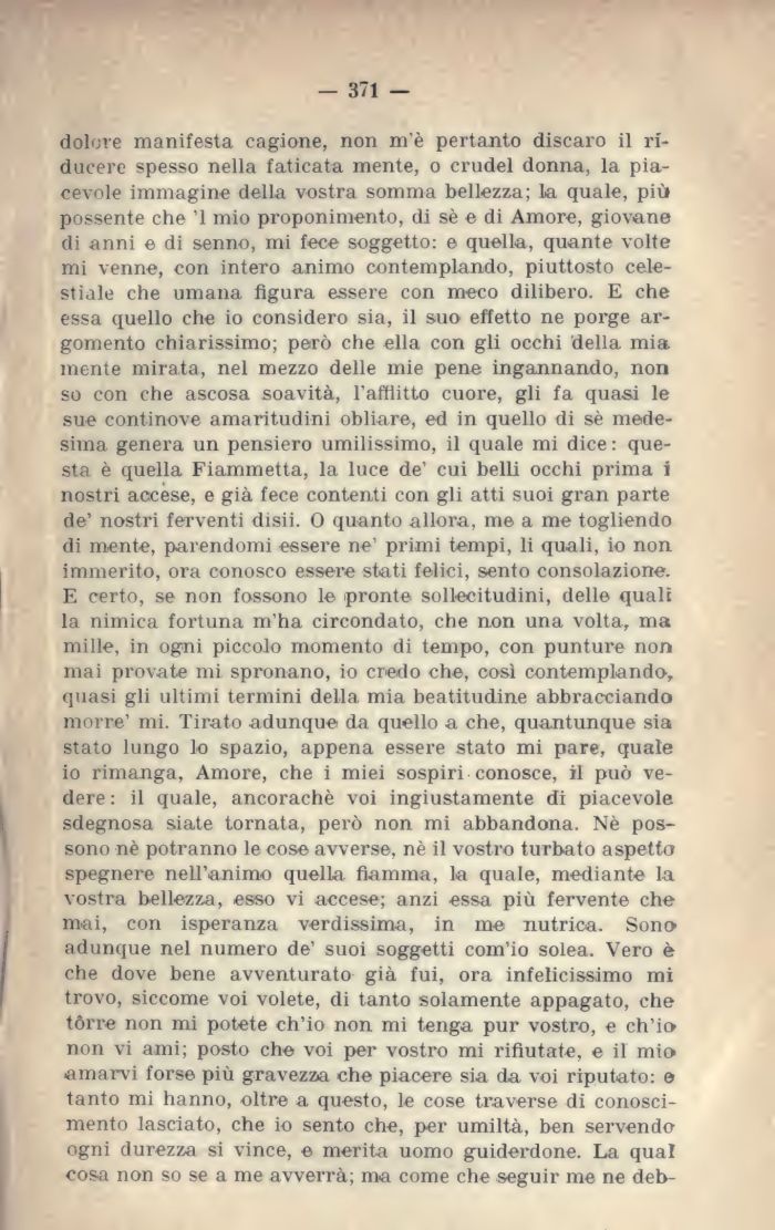 dolore manifesta cagione, non m'è pertanto discaro il ri-ducere spesso nella faticata mente, o crudel donna, la piacevole immagine della vostra somma bellezza; La quale, piò possente che '1 mio proponimento, di sè e di Amore, giovane di anni e di senno, mi fece soggetto: e quella, quante volte mi venne, con intero animo contemplando, piuttosto celestiale che umana figura essere con meco dilibero. E che essa quello che io considero sia, il suo effetto ne porge argomento chiarissimo; però che ella con gli occhi della mia mente mirata, nel mezzo delle mie pene ingannando, non so con che ascosa soavità, l'afflitto cuore, gli fa quasi le sue continove amaritudini obliare, ed in quello di sè medesima genera un pensiero umilissimo, il quale mi dice : questa è quella Fiammetta, la luce de' cui belli occhi prima i nostri accése, e già fece contenti con gli atti suoi gran parte de' nostri ferventi disii. O quanto allora, me a me togliendo di mente, parendomi essere ne' primi tempi, li quali, io non immerito, ora conosco essere stati felici, sento consolazione. E certo, se non tossono le pronte sollecitudini, delle quali la nimica fortuna m'ha circondato, che non una volta, ma mille, in ogni piccolo momento di tempo, con punture non mai provate mi spronano, io credo che, così contemplando, quasi gli ultimi termini della mia beatitudine abbracciando morre' mi. Tirato adunque da quello a che, quantunque sia stato lungo lo spazio, appena essere stato mi pare, quale io rimanga, Amore, che i miei sospiri conosce, il può vedere : il quale, ancoraché voi ingiustamente di piacevole sdegnosa siate tornata, però non mi abbandona. Nè possono né potranno le cose avverse, nè il vostro turbato aspetto spegnere nell'animo quella fiamma, la quale, mediante la vostra bellezza, esso vi accese; anzi essa più fervente che mai, con isperanza verdissima, in me nutrica. Sono adunque nel numero de' suoi soggetti com'io solea. Vero è che dove bene avventurato già fui, ora infelicissimo mi trovo, siccome voi volete, di tanto solamente appagato, che tórre non mi potete ch'io non mi tenga pur vostro, e ch'io non vi ami; posto che voi per vostro mi rifiutate, e il mio amarvi forse più gravezza che piacere sia da voi riputato: e tanto mi hanno, oltre a questo, le cose traverse di conoscimento lasciato, che io sento che, per umiltà, ben servendo ogni durezza si vince, e merita uomo guiderdone. La qual cosa non so se a me avverrà; ma come che seguir me ne deb-