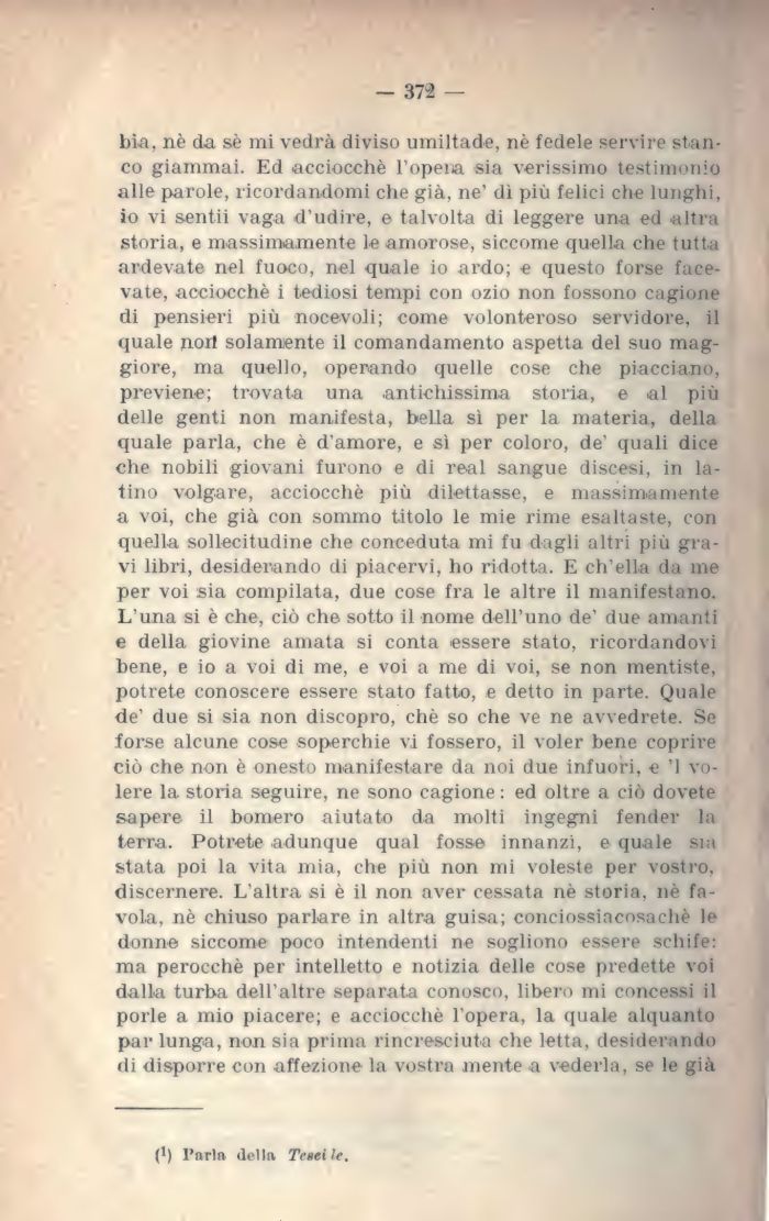 bùi, nè da sè mi vedrà diviso umiltade, nè fedele servire stanco giammai. Ed acciocché l'opera sia verissimo testimonio alle parole, ricordandomi che già, ne' dì più felici che lunghi, io vi sentii vaga d'udire, e talvolta di leggere una ed altra storia, e massimamente le amorose, siccome quella che tutta ardevate nel fuoco, nel quale io ardo; e questo forse facevate, acciocché i tediosi tempi con ozio non fossono cagione di pensieri più nocevoli; come volonteroso servidore, il quale fiori solamente il comandamento aspetta del suo maggiore, ma quello, operando quelle cose che piacciano, previene; trovata una antichissima storia, e al più delle genti non manifesta, bella sì per la materia, della quale parla, che è d'amore, e sì per coloro, de' quali dice che nobili giovani furono e di real sangue discesi, in latino volgare, acciocché più dilettasse, e massimamente a voi, che già con sommo titolo le mie rime esaltaste, con quella sollecitudine che conceduta mi fu dagli altri più gravi libri, desiderando di piacervi, ho ridotta. E ch'ella da me per voi sia compilata, due cose fra le altre il manifestano. L'una si è che, ciò che sotto il nome dell'uno de' due amanti e della giovine amata si conta essere stato, ricordandovi bene, e io a voi di me, e voi a me di voi, se non mentiste, potrete conoscere essere stato fatto, e detto in parte. Quale de' due si sia non discopro, chè so che ve ne avvedrete. Se forse alcune cose soperchie vi fossero, il voler bene coprire ciò che non è onesto manifestare da noi due infuori, e '1 volere la storia seguire, ne sono cagione : ed oltre a ciò dovete sapere il bomero aiutato da molti ingegni fender la terra. Potrete adunque qual fosse innanzi, e quale sin stata poi la vita mia, che più non mi voleste per vostro, discernere. L'altra si è il non aver cessata nè storia, nè favola, nè chiuso parlare in altra guisa; conciossiacosaché le donne siccome poco intendenti ne sogliono essere schife: ma perocché per intelletto e notizia delle cose predette voi dalla turba dell'altre separata conosco, libero mi concessi il porle a mio piacere; e acciocché l'opera, la quale alquanto par lunga, non sia prima rincresciuta che letta, desiderando di disporre con affezione la vostra mente a vederla, se le già