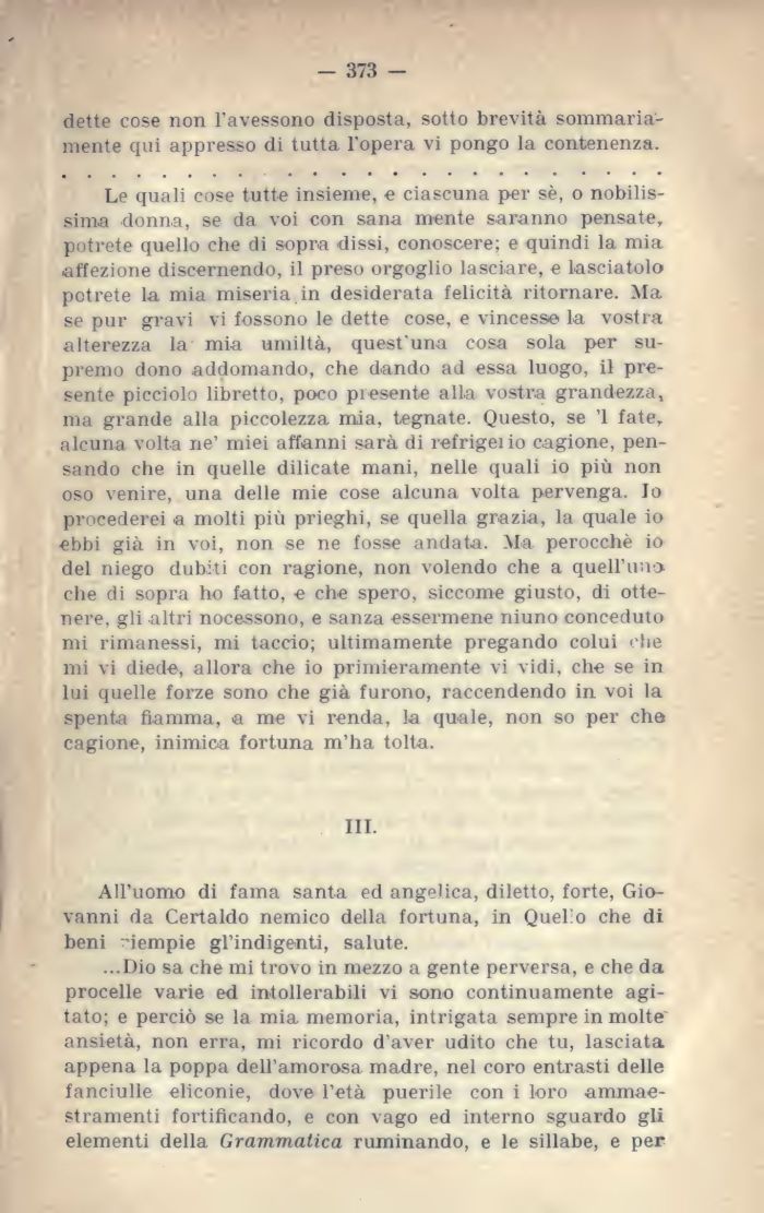 Le quali cose tutte insieme, e ciascuna per sè, o nobilissima donna, se da voi con sana mente saranno pensate, potrete quello che di sopra dissi, conoscere; e quindi la mia affezione discernendo, il preso orgoglio lasciare, e lasciatolo potrete la mia miseria in desiderata felicità ritornare. Ma se pur gravi vi tossono le dette cose, e vincesse la vostra alterezza la mia umiltà, quest'una cosa sola per supremo dono addomando, che dando ad essa luogo, il presente picciolo libretto, poco presente alla vostra grandezza, ma grande alla piccolezza mia, tegnate. Questo, se '1 fate, alcuna volta ne' miei affanni sarà di refrigeiio cagione, pensando che in quelle dilicate mani, nelle quali io più non oso venire, una delle mie cose alcuna volta pervenga. Io procederei a molti più prieghi, se quella grazia, la quale io ebbi già in voi, non se ne fosse andata. Ma perocché io del niego dubiti con ragione, non volendo che a quell'uno che di sopra ho fatto, e che spero, siccome giusto, di ottenere, gli altri nocessono, e sanza essermene niuno conceduto mi rimanessi, mi taccio; ultimamente pregando colui che mi vi diede, allora che io primieramente vi vidi, che se in lui quelle forze sono che già furono, raccendendo in voi la spenta fiamma, a me vi renda, la quale, non so per che cagione, inimica fortuna m'ha tolta.