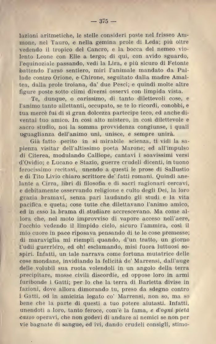 Già fatto .perito in sì mirabile scienza, ti vidi la sapienza visitar dell'altissimo poeta Marone; ed all'impulso di Citerea, modulando Calliope, cantavi i soavissimi versi d'Ovidio; e Lucano e Stazio, guerre crudeli dicenti, in tuono ferocissimo recitavi, unendo a questi le prose di Sallustio e di Tito Livio chiaro scrittore de' fatti romani. Quindi anelante a Cirra, libri di filosofia e di sacri ragionari cercavi, e debitamente osservando religione e culto degli Dei, la loro grazia bramavi, senza pari laudando gli studi e la vita pacifica e queta; cose tutte che dilettavano l'animo amico, ed in esso la brama di studiare accrescevano. Ma come allora che, nel moto improvviso di vapore acceso nell'aere, l'occhio vedendo il limpido cielo, sicuro l'ammira, così il mio cuore in pace riposava pensando di te le cose premesse; di maraviglia mi riempii quando, d'un tratto, un giorno t'udii guerrièro, ed oh! esclamando, misi fuora luttuosi sospiri. Infatti, un tale narrava come fortuna mutatrice delle cose mondane, invidiando la felicità de' Marrensi, dall'auge delle volubil sua ruota volendoli in un angolo della terra precipitare, mosse civili discordie, ed oppose loro in armi furibonde i Gatti; per lo che la terra di Barletta divise in fazioni, dove allora dimorando tu, preso da sdegno contro i Gatti, od in amicizia legato co' Marrensi, non so, ma so bene che la parte di questi a tuo potere aiutasti. Infatti, unendoti a loro, tanto feroce, com'è la fama, e d'ogni pietà casso operavi, che non godevi di andare ai nemici se non per vie bagnate di sangue, ed ivi, dando crudeli consigli, stimo-