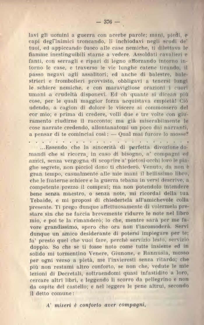 ...Essendo che la sincerità di perfetta divozione domandi che si ricorra, in caso di bisogno, a' compagni ed amici, senza vergogna di scoprire a' pietosi occhi loro le piaghe segrete, non ipicciol dono ti chiederò. Venuto, da non è gran tempo, casualmente alle mie mani il bellissimo libro, che le fraterne schiere e la guerra tebana in versi descrive, a competente prezzo il comprai; ma non potendolo intendere bene senza maestro, o senza note, mi ricordai della tua Tebaide, e mi proposi di chiedertela all'amichevole colla presente. Ti prego dunque affettuosamente di volermela prestare sin che ne faccia brevemente ridurre le note nel libro mio, e poi te la rimanderò; lo che, mentre sarà per me favore grandissimo, spero che ora non t'incomoderà. Servi dunque un amico desiderante di potersi impiegare per te; fa' presto quel che vuoi fare, perchè servizio lesto, servizio doppio. So che se ti fosse noto come tutte insieme ed in solido mi tormentino Venere, Giunone, e Rannusia, mosso per ogni verso a pietà, me l'invieresti senza ritardo; che più non restami altro conforto, se non che, vedute le mie lezioni di Decretali, sottraendomi quasi infastidito a loro, cercare altri libri, e leggendo li scorro da pellegrino e non da ospite del castello; e nel leggere le pene altrui, secondo il detto comune: