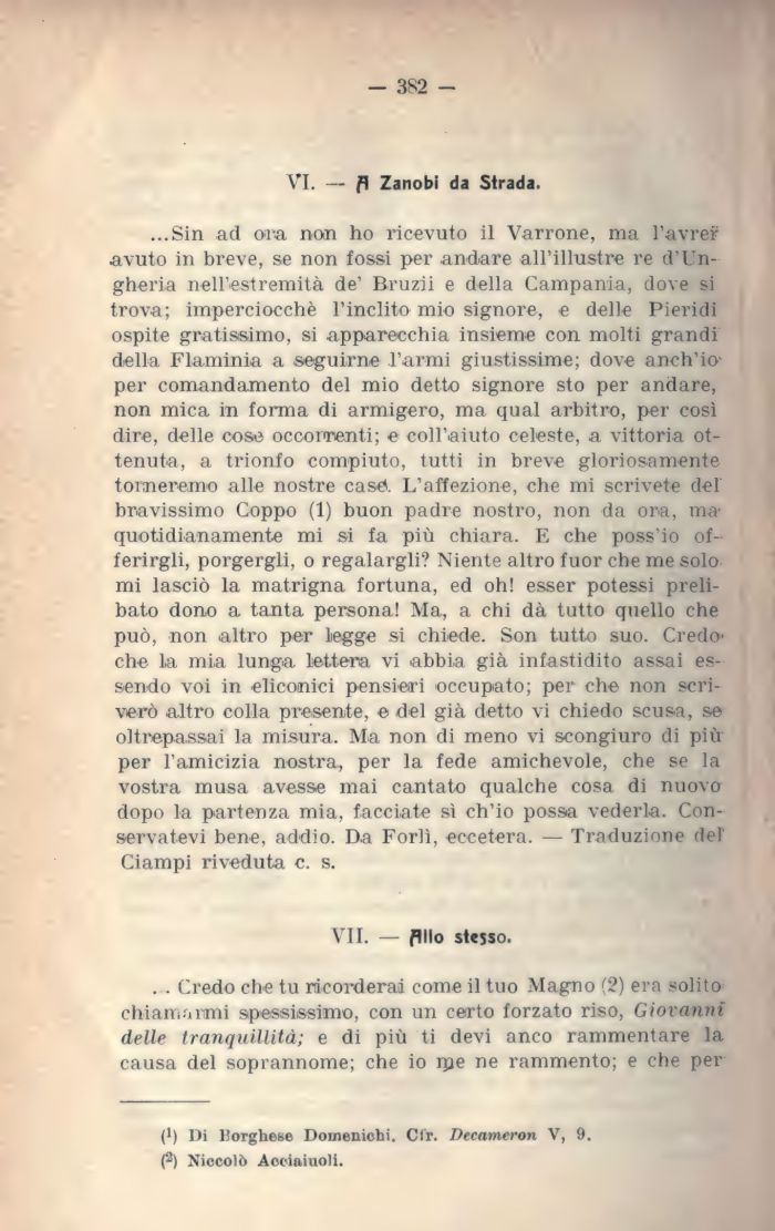 ...Sin ad ora non ho ricevuto il Varrone, ma l'avrer avuto in breve, se non fossi per andare all'illustre re d'Ungheria nell'estremità de' Rruzii e della Campania, dove si trova; imperciocché l'inclito mio signore, e delle Pieridi ospite gratissimo, si apparecchia insieme con molti grandi della Flaminia a seguirne l'armi giustissime; dove anch'io-per comandamento del mio detto signore sto per andare, non mica in forma di armigero, ma qual arbitro, per così dire, delle cose occorrenti; e coll'aiuto celeste, a vittoria ottenuta, a trionfo compiuto, tutti in breve gloriosamente torneremo alle nostre casé. L'affezione, che mi scrivete del bravissimo Coppo (1) buon padre nostro, non da ora, ma quotidianamente mi si fa più chiara. E che poss'io offerirgli, porgergli, o regalargli? Niente altro fuor che me solo mi lasciò la matrigna fortuna, ed oh! esser potessi prelibato dono a tanta persona! Ma, a chi dà tutto quello che può, non altro per legge si chiede. Son tutto suo. Credo» che la mia lunga lettera vi abbia già infastidito assai essendo voi in eliconici pensieri occupato; per che non scriverò altro colla presente, e del già detto vi chiedo scusa, se oltrepassai la misura. Ma non di meno vi scongiuro di più per l'amicizia nostra, per la fede amichevole, che se la vostra musa avesse mai cantato qualche cosa di nuovo dopo la partenza mia, facciate sì ch'io possa vederla. Conservatevi bene, addio. Da Forlì, eccetera. — Traduzione del Ciampi riveduta c. s.