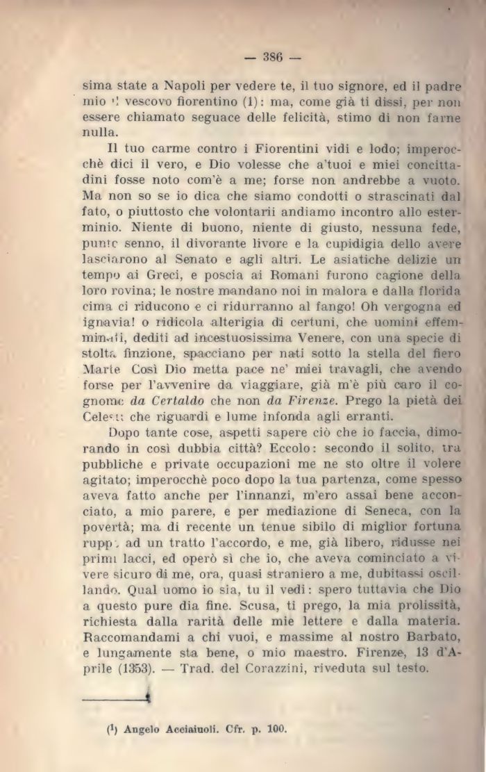 Il tuo carme contro i Fiorentini vidi e lodo; imperocché dici il vero, e Dio volesse che a'tuoi e miei concittadini fosse noto com'è a me; forse non andrebbe a vuoto. Ma non so se io dica che siamo condotti o strascinati dal fato, o piuttosto che volontarii andiamo incontro allo esterminio. Niente di buono, niente di giusto, nessuna fede, punte senno, il divorante livore e la cupidigia dello avere lasciarono al Senato e agli altri. Le asiatiche delizie un tempo ai Greci, e poscia ai Romani furono cagione della loro rovina; le nostre mandano noi in malora e dalla florida cima ci riducono e ci ridurranno al fango! Oh vergogna ed ignavia! o ridicola alterigia di certuni, che uomini effeminine ìi, dediti ad incestuosissima Venere, con una specie di stolta finzione, spacciano per nati sotto la stella del fiero Marte Così Dìo metta pace ne' miei travagli, che avendo forse per l'avvenire da viaggiare, già m'è più caro il cognome da Certaldo che non da Firenze. Prego la pietà dei Celect; che riguardi e lume infonda agli erranti.