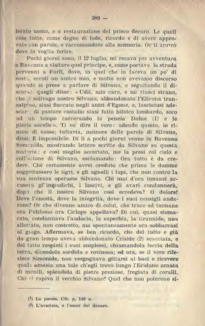 Pochi giorni sono, il 12 luglio, mi recava per avventura a Ravenna a visitare quel principe, e, come portava la strada pervenni a Forlì, dove, in quel che io faceva un po' di sost i, eccoti un amico mio, e molto non avevamo discorso quando si prese a parlare di Salvano, e seguitando il discorso quegli disse : « Udii, mio caro, e mi riuscì strano, che :i solivago nostro Silvano, abbandonato l'Elicona transalpino, siasi fiaccato negli antri d'Egone, e, lasciatosi adescai'- di pastore castalio siasi fatto bifolco lombardo, seco ad un tempo carcerando la peneia Dafne (1) e le pierie sorelle». Ti vo dire il vero: udendo questo, io rimasi di sasso; tuttavia, memore delle parole di Silvano, dissi: E impossibile. Di lì a pochi giorni venne in Ravenna Som; jiide, mostrando lettere scritte da Silvano su questa materia: e così meglio accertato, me la presi col cielo e eeil'arione di Sdivano, esclamando: Ora tutto è da credere. Chè certamente avrei creduto che prima le damme soggettassero le tigri, e gli agnelli i lupi, che non contro la sua sentenza operasse Silvano. Chi mai d'ora innanzi accuserà gì' impudichi, i lascivi, e gli avari condannerà, dopo che il nostro Silvano così eccedeva? O dolore! Dove l'onestà, dove la integrità, dove i suoi consigli andarono? Or che divenne amico di colui, che truce ed immane ora Polifemo ora Ciclope appellava? Di cui, quasi stomacato, condannava l'audacia, la superbia, la tirannide, non allettato, non costretto, ma spontaneamente ora sobbarcasi al giogo. Affermava, se ben ricordo, che del tutto e già da gran tempo aveva abbandonato Criside (2) scacciata, e del tutto respinti i suoi amplessi, chiamandola feccia della terra, dicendola sordida e rovinosa; ed ora, se il vero riferisce Simonide, non vergognava gàttarsi ai baci e ricevere quali amasia una tale ch'egli trovò lungo 1'E.ridamo ornata dì monili, splendida di pietre preziose, fregiata di coralli. Chi -i rapiva il vecchio Silvano? Quel che non poterono si-