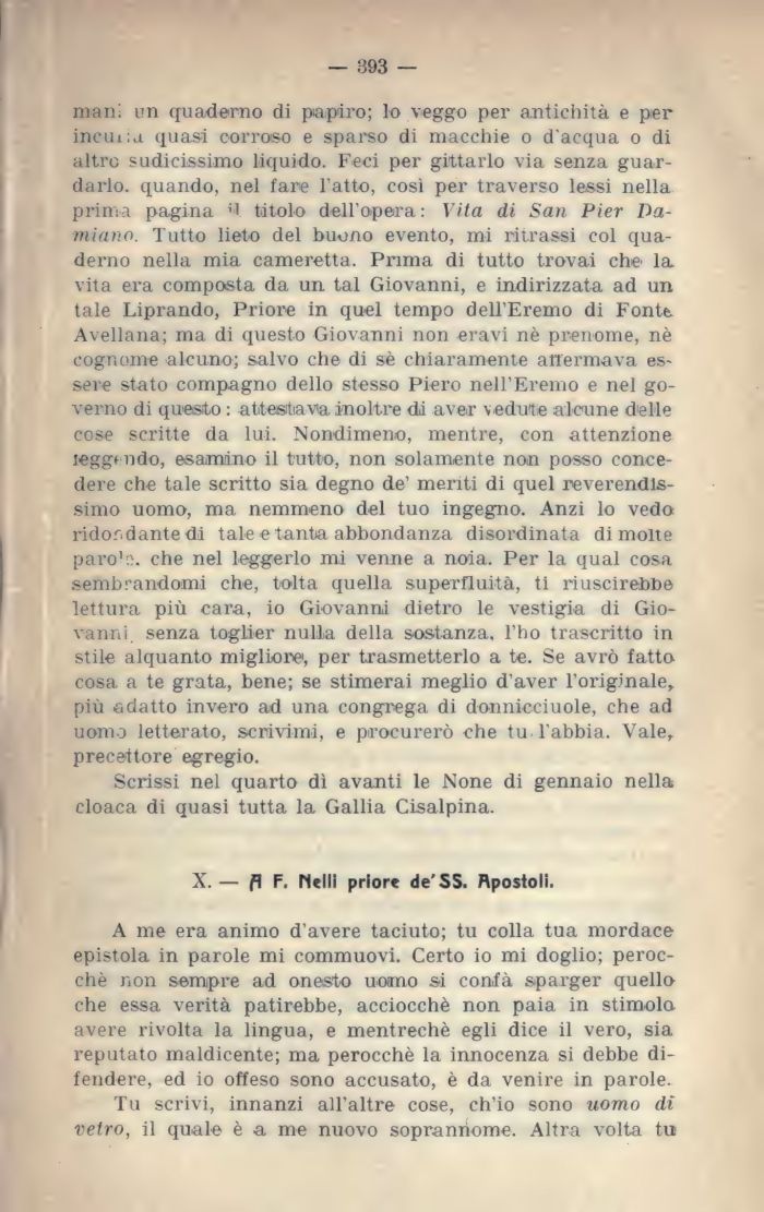 mani un quaderno di papiro; lo veggo per antichità e per incili ;a quasi corroso e sparso di macchie o d'acqua o di altro sudicissimo liquido. Feci per gittarlo via senza guardarlo. quando, nel fare l'atto, così per traverso lessi nella prima pagina titolo dell'opera: Vita di San Pier Damiano. Tutto lieto del buono evento, mi ritrassi col quaderno nella mia cameretta. Prima di tutto trovai che la vita era composta da un tal Giovanni, e indirizzata ad un tale Liprando, Priore in quel tempo dell'Eremo di Fontt Avellana; ma di questo Giovanni non eravi nè prenome, nè cognome alcuno; salvo che di sè chiaramente affermava essere stato compagno dello stesso Piero nell'Eremo e nel governo di quesito : attestava inoltre di aver v edute alcune delle cose scritte da lui. Nondimeno, mentre, con attenzione leggendo, esamino il tutto, non solamente non posso concedere che tale scritto sia degno de' meriti di quel reverendissimo uomo, ma nemmeno del tuo ingegno. Anzi lo vedo ridondante di tale e tanta abbondanza disordinata di molte paro'o. che nel leggerlo mi venne a noia. Per la qual cosa sembrandomi che, tolta quella superfluità, ti riuscirebbe lettura più cara, io Giovanni dietro le vestigia di Giovanni senza toglier nulla della sostanza, l'ho trascritto in stile alquanto migliore', per trasmetterlo a te. Se avrò fatto cosa a te grata, bene; se stimerai meglio d'aver l'originale, più adatto invero ad una congrega di donnicciuole, che ad uomo letterato, scrivimi, e procurerò che tu l'abbia. Vale, precettore egregio.