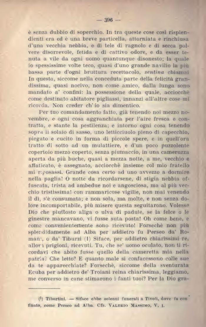 11 dì, s'è consumata; e non sola, ma molte, e non senza dolore incomportabile, più misere questa seguitarono. Volesse Dio che piuttosto aliga o ulva di padule, se la felce o le ginestre mancavano, vi fusse suta posta! Oh come bene, e come convenientemente sono ricevuto! Forsechè non più splendidamente ad Alba per addietro fu Perseo da' Roman-, o da' Tiburzi (1) Siface, per addietro chiarissimi re. allori prigioni, ricevuti. Tu, che se' uomo oculato, non ti ricordavi che abito fusse quello della cameretta mia nella patria? Che letto? E quanto male si confacessono colle sue da te apparecchiate? Forsechè, siccome della sventurata Ecuba per addietro de' Troiani reina chiarissima, leggiamo, me converso in cane stimarono i fanti tuoi? Per la Dio gra-