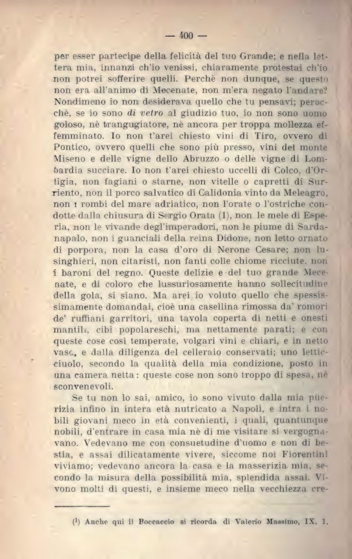 per esser partecipe della felicità del tuo Grande; e nella lettera mia, innanzi ch'io venissi, chiaramente protestai ch'io non potrei sofferire quelli. Perchè non dunque, se questo non era all'animo di Mecenate, non m'era negato l'andare? Nondimeno io non desiderava quello che tu pensavi; perocché, se io sono di vetro al giudizio tuo, io non sono uomo goloso, nè trangugiatone, nè ancora per troppa mollezza ef-femminato. Io non t'arei chiesto vini di Tiro, ovvero di Pontico, ovvero quelli che sono più presso, vini del monte Miseno e delle vigne dello Abruzzo o delle vigne di Lombardia succiare. Io non t'arei chiesto uccelli di Coleo, d'Or-tigia, non fagiani o starne, non vitelle o capretti di Sur-riento, non il porco salvatico di Galidonia vinto da Meleagro, non 1 rombi del mare adriatico, non l'orate o l'ostriche condotte dalla chiusura di Sergio Orata (1), non le mele di Esperia, non le vivande degl'imperaidori, non le piume di Sarda-napalo, non i guanciali della reina Didone, non letto ornato di porpora, non la casa d'oro di Nerone Cesare; non lusinghieri, non citaristi, non fanti colle chiome ricciute, non i baroni del regno. Queste delizie e del tuo grande Mecenate, e di coloro che lussuriosamente hanno sollecitudine della gola, si siano. Ma arei io voluto quello che spessissimamente domandai, cioè una casellina rimossa da' romori de' ruffiani garritori, una tavola coperta di netti e onesti mantili, cibi popolareschi, ma nettamente parati; e con queste cose così temperate, volgari vini e chiari, e in netto vast, e dalla diligenza del celleraio conservati; uno lettic-•ciuolo, secondo la qualità della mia condizione, posto in una camera netta: queste cose non sono troppo di spesa, nè sconvenevoli.