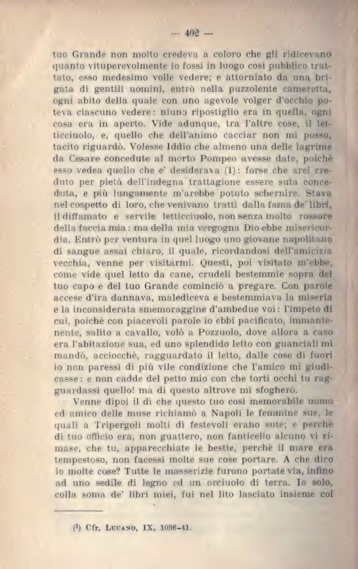 tuo Grande non molto credeva a coloro che gli ridicevano quanto vituperevolmente io fossi in luogo così pubblico trattato, esso medesimo volle vedere; e attorniato da una brigata di gentili uomini, entrò nella puzzolente cameretta, ogni abito della quale con uno agevole volger d'occhio poteva ciascuno vedere: niuno ripostiglio era in quella, ogni cosa era in aperto. Vide adunque, tra l'altre cose, il let-ticciuolo, e, quello che dell'animo cacciar non mi posso, tacito riguardò. Volesse Iddio che almeno una delle lagrime da Cesare concedute al morto Pompeo avesse date, poiché esso vedea quello che e' desiderava (1): forse che arei creduto per pietà dell'indegna trattagione essere suta conceduta, e più lungamente m'arabbe potuto schernire. Stava nel cospetto di laro, che venivano tratti dalla faima de'libri, il diffamato e servile letticciuolo, non senza molto rossore della faccia mia : ma della mia vergogna. Dio ebbe misericordia. Enitrò per ventura in quel luogo uno giovane napolitano di sangue assai chiaro, il quale, ricordandosi dell'amicizia vecchia, venne per visitarmi. Questi, poi visitato m'ebbe, come vide quel letto da cane, crudeli bestemmie sopra del tuo capo e del tuo Grande cominciò a pregare. Con parole accese d'ira dannava, malediceva e bestemmiava la miseria e la inconsiderata smemoraggine d'ambedue voi : l'impeto di cui, poiché con piacevoli parole io ebbi pacificato, immante-nente, salito a cavallo, volò a Pozzuolo, dove allora a caso era l'abitazione sua, ed uno splendido letto con guanciali mi mandò, acciocché, ragguardato il letto, dalle cose di fuori io non paressi di più vile condizione che l'amico mi giudicasse: e non cadde del petto mio con che torti occhi tu rag-guardassi quello! ma di questo altrove mi sfogherò.