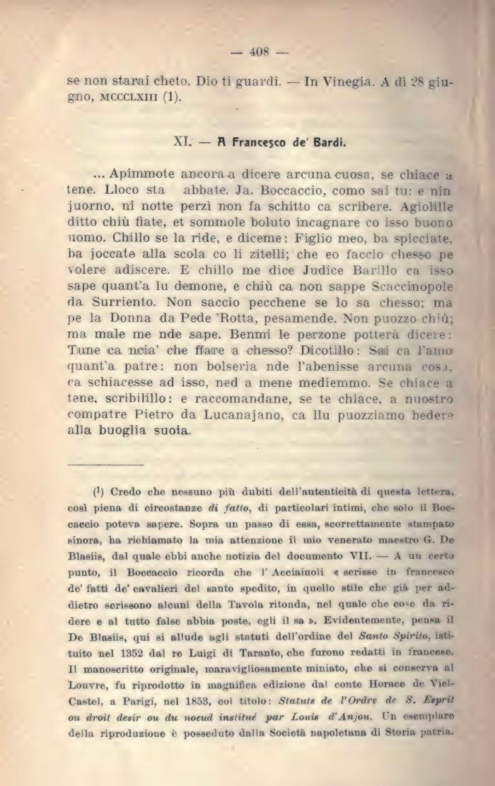 (!) Credo che nessuno più dubiti dell'autenticità di questa lettera, così piena di circostanze di fallo, di particolari intimi, che solo il Boccaccio poteva sapere. Sopra un passo di essa, scorrettamente stampato sinora, ha richiamato la mia attenzione il mio venerato maestro G. De Blasiis, dal quale ebbi anche notizia del dooumento VII. — A un certo punto, il Boocaccio ricorda che 1' Acciaiuoli « scrisse in francesco de' fatti de' cavalieri del santo spedito, in quello stile che già per addietro scrissono alcuni della Tavola ritonda, nel quale che co=e da ridere e al tutto false abbia poste, egli il sa ». Evidentemente, pensa il De Blasiis, qui si allude agli statuti dell'ordine del Santo Spii-ilo, istituito nel 1852 dal re Luigi di Taranto, che furono redatti in francese.