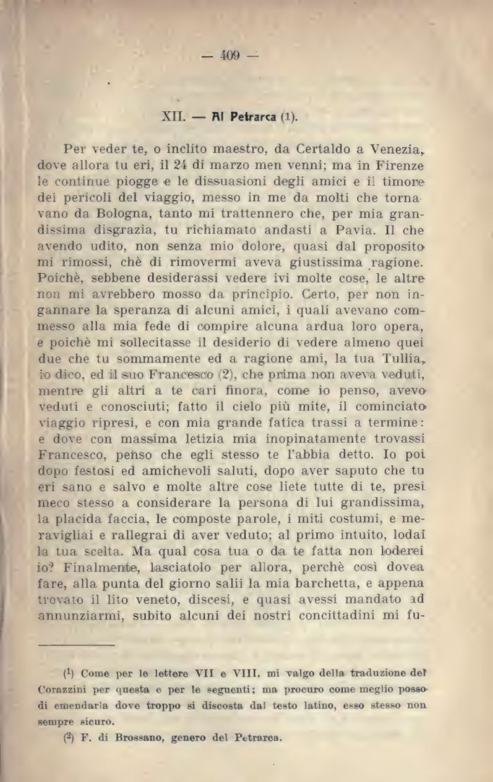 Per veder te, o inclito maestro, da Certaldo a Venezia, dove allora tu eri, il 24 di marzo men venni; ma in Firenze le continue piogge e le dissuasioni degli amici e il timore dei pericoli del viaggio, messo in me da molti che torna vano da Bologna, tanto mi trattennero che, per mia grandissima disgrazia, tu richiamato andasti a Pavia. Il che avendo udito, non senza mio dolore, quasi dal proposito mi rimossi, chè di rimovermi aveva giustissima ragione. Poiché, sebbene desiderassi vedere ivi molte cose, le altre non mi avrebbero mosso da principio. Certo, per non ingannare la speranza di alcuni amici, i quali avevano commesso alla mia fede di compire alcuna ardua loro opera, e poiché mi sollecitasse il desiderio di vedere almeno quei due che tu sommamente ed a ragione ami, la tua Tullia, io dico, ed il suo Francesco (2), che prima non aveva veduti, mentre gli altri a te cari finora, come io penso, avevo veduti e conosciuti; fatto il cielo più mite, il cominciato viaggio ripresi, e con mia grande fatica trassi a termine: e dove con massima letizia mia inopinatamente trovassi Francesco, penso che egli stesso te l'abbia detto. Io poi dopo festosi ed amichevoli saluti, dopo aver saputo che tu eri sano e salvo e molte altre cose liete tutte di te, presi meco stesso a considerare la persona di lui grandissima, la placida faccia, le composte parole, i miti costumi, e meravigliai e rallegrai di aver veduto; al primo intuito, lodai la tua scelta. Ma qual cosa tua o da te fatta non loderei io? Finalmente, lasciatolo per allora, perchè cosi dovea fare, alla punta del giorno salii la mia barchetta, e appena trovato il lito veneto, discesi, e quasi avessi mandato ad annunziarmi, subito alcuni dei nostri concittadini mi fu-