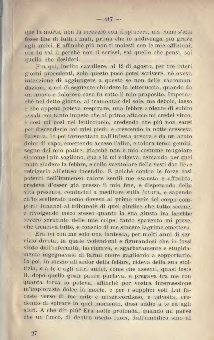 Fin qui, inclito cavaliere, ai 12 di agosto, per tre interi giorni prscedenti, solo questo poco potei scrivere, nè aveva intenzione di aggiungere a questo se non deKe raccomandazioni, e nel dì seguente chiudere la letteruccia, quando da un nuovo e doloroso caso fu rotto il mio proposito. Imperocché nel detto giorno, al tramontar del sole, me debole, lasso e che appena poteva respirare, una febbre ardente! di subito assali con tanto impeto che al primo attacco mi credei vinto, e così mi posi nel letticciuolo, credendo che più non sarei per discenderlo coi miei piedi, e crescendo la notte cresceva, l'arsura, lo poi tormentato dall'infesta arsura ei da un acuto dolor di capo, emettendo acceso l'alilo, e talora tenui gemiti, segno del mio patire, giacché non è mio costume mugolare siccome i più sogliono, qua e là mi volgeva, cercando per quel moto eludere la febbre, e collo sventolare delle vesti dar lieve refrigerio all'etneo incendio. E poiché contro le forze così potenti dell'immenso calore sentii me esausto e affralito, credeva d'esser già presso il mio fine, e disperando della vita presante, cominciai a meditare sulla futura, e sapendo ch'io scellerato uomo doveva al primo uscir del corpo comparir innanzi al tribunale di quel giudice che tutto scerne, e rivolgendo meco stesso quanto la sua giusta ira farebbe severo scrutinio delle mie colpe, tanto spavento mi prese, che tremava tutto, e conscio di me sincere lagrime emetteva.