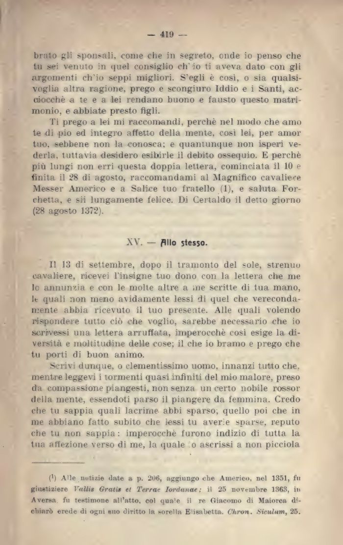 Ti prego a lei mi raccomandi, perchè nel modo che amo te di pio ed integro affetto della mente, così lei, per amor tuo, sebbene non la conosca; e quantunque non isperi vederla, tuttavia desidero esibirle il debito ossequio. E perchè più lungi non erri questa doppia lettera, cominciata il 10 e finita il 28 di agosto, raccomandami al Magnifico cavaliere Messer Americo e a Salice tuo fratello (1), e saluta Forchetta, e sii lungamente felice. Di Certaldo il detto giorno (28 agosto 1372).