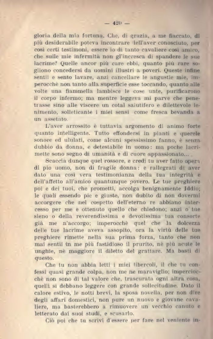 Scaccia dunque quel rossore, e credi tu aver fatto oper i di pio uomo, non di fragile donna: e rallegrati di aver dato una così vera testimonianza della tua integrità e dell'affetto all'amico quantunque povero. Le tue preghiere poi e dei tuoi, che prometti, accolga benignamente Iddio; le quali essendo pie e giuste, non dubito di non dovermi accorgere che nel cospetto dell'eterno re abbiano intercesso per me e ottenuto quello che chiedono; anzi o tue sieno o della reverendissima e devotissima tua consorte già me n'accorgo; imperocché quel che la dolcezza delie tue lacrime aveva assopito, ora la virtù delle tue preghiere rimette nella sua prima forza, tanto che non mai sentii in me più fastidioso il prurito, nè più acute le unghie, né maggiore il diletto del grattare. Ma basti di questo.
