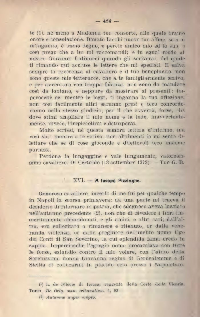Generoso cavaliere, incerto di me fui per qualche tempo in Napoli la scorsa primavera: da una parte mi traeva il desiderio di ritornare in patria, che sdegnoso aveva lasciato nell'autunno precedente (2), ncm. che di rivedere i libri lim-meritamente abbandonati, e gli amici, e altri cari; dall'altra, era sollecitato a rimanere e ritenuto, or dalla veneranda violenza, or dalle preghiere dell'inclito uomo Ugo dei Conti di San Severino, la cui splendida fama credo tu sappia. Imperciocché l'egregio uomo procacciava con tutte le forze, eziandio contro il mio volere, con l'aiuto della Serenissima donna Giovanna regina di Gerusalemme e di Sicilia di collocarmi in placido ozio presso i Napoletani.