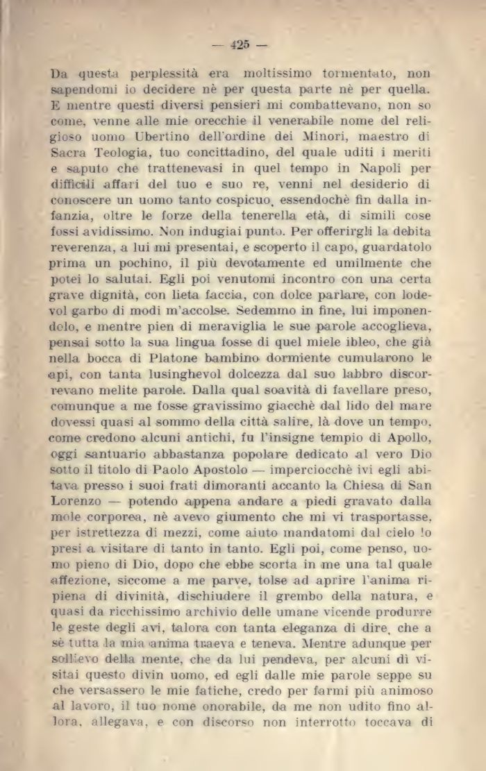 Da questa perplessità era moltissimo tormentato, non sapendomi io decidere nè per questa parte nè per quella. E mentre questi diversi pensieri mi combattevano, non so come, venne alle mie orecchie il venerabile nome del religioso uomo Ubertino dell'ordine dei Minori, maestro di Sacra Teologia, tuo concittadino, del quale uditi i meriti e saputo che trattenevasi in quel tempo in Napoli per diffìcili affari del tuo e suo re, venni nel desiderio di conoscere un uomo tanto cospicuo, essendoché fin dalla infanzia, oltre le forze della tenerella età, di simili cose fossi avidissimo. Non indugiai punto. Per offerirgli la debita reverenza, a lui mi presentai, e scoperto il capo, guardatolo prima un pochino, il più devotamente ed umilmente che potei lo salutai. Egli poi venutomi incontro con una certa grave dignità, con lieta faccia, con dolce parlare, con lode-vol garbo di modi m'accolse. Sedemmo in fine, lui imponendolo, e mentre pien di meraviglia le sue parole accoglieva, pensai sotto la sua lingua fosse di quel miele ibleo, che già nella bocca di Platone bambino dormiente cumularono le api, con tanta lusinghevol dolcezza dal suo labbro discorrevano melite parole. Dalla qual soavità di favellare preso, comunque a me fosse gravissimo giacché dal lido del mare dovessi quasi al sommo della città salire, là dove un tempo, come credono alcuni antichi, fu l'insigne tempio di Apollo, oggi santuario abbastanza popolare dedicato al vero Dio sotto il titolo di Paolo Apostolo — imperciocché ivi egli abitava presso i suoi frati dimoranti accanto la Chiesa di San Lorenzo — potendo appena andare a piedi gravato dalla mole corporea, nè avevo giumento che mi vi trasportasse, per istrettezza di mezzi, come aiuto mandatomi dal cielo lo presi a visitare di tanto in tanto. Egli poi, come penso, uomo pieno di Dio, dopo che ebbe scorta in .me una tal quale affezione, siccome a me parve, tolse ad aprire l'anima ripiena di divinità, dischiudere il grembo della natura, e quasi da ricchissimo archivio delle umane vicende produrre le geste degli avi, talora con tanta eleganza di dire, che a sé tutta la mia anima tua èva e teneva. Mentre adunque per sollievo della mente, che da lui pendeva, per alcuni dì visitai questo divin uomo, ed egli dalle mie parole seppe su che versassero le mie fatiche, credo per farmi più animoso al lavoro, il tuo nome onorabile, da me non udito fino allora, allegava, e con discorso non interrotto toccava di