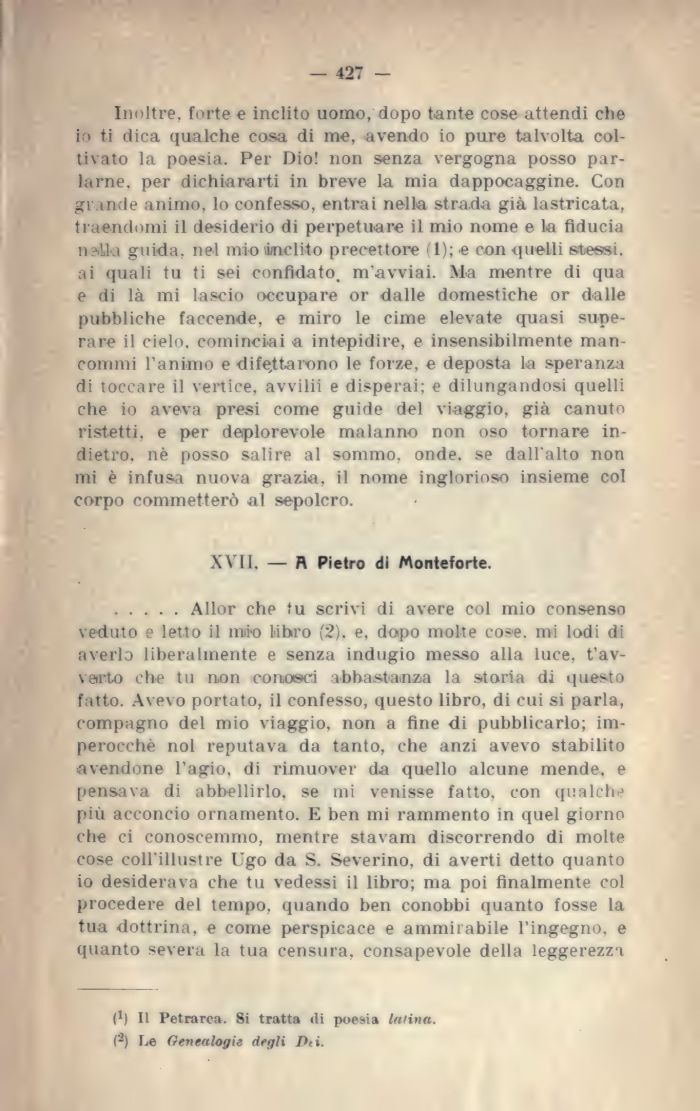 Inoltre, forte e inclito uomo, dopo tante cose attendi che ir» ti dica qualche cosa di me, avendo io pure talvolta coltivato la poesia. Per Dio! non senza vergogna posso parlarne. per dichiararti in breve la mia dappocaggine. Con grande animo, lo confesso, entrai nella strada già lastricata, traendomi il desiderio di perpetuare il mio nome e la fiducia 11 ! i guida, nel mio .inclito precettore 1); e con quelli stessi, ai quali tu ti sei confidato, m'avviai. Ma mentre di qua e di là mi lascio occupare or dalle domestiche or dalle pubbliche faccende, e miro le cime elevate quasi superare il cielo, cominciai a intepidire, e insensibilmente man-commi l'animo e difettarono le forze, e deposta la speranza di toccare il vertice, avvilii e disperai; e dilungandosi quelli che io aveva presi come guide del viaggio, già canuto ristetti, e per deplorevole malanno non oso tornare indietro, nè posso salire al sommo, onde, se dall'alto non mi è infusa nuova grazia, il nome inglorioso insieme col corpo commetterò al sepolcro.