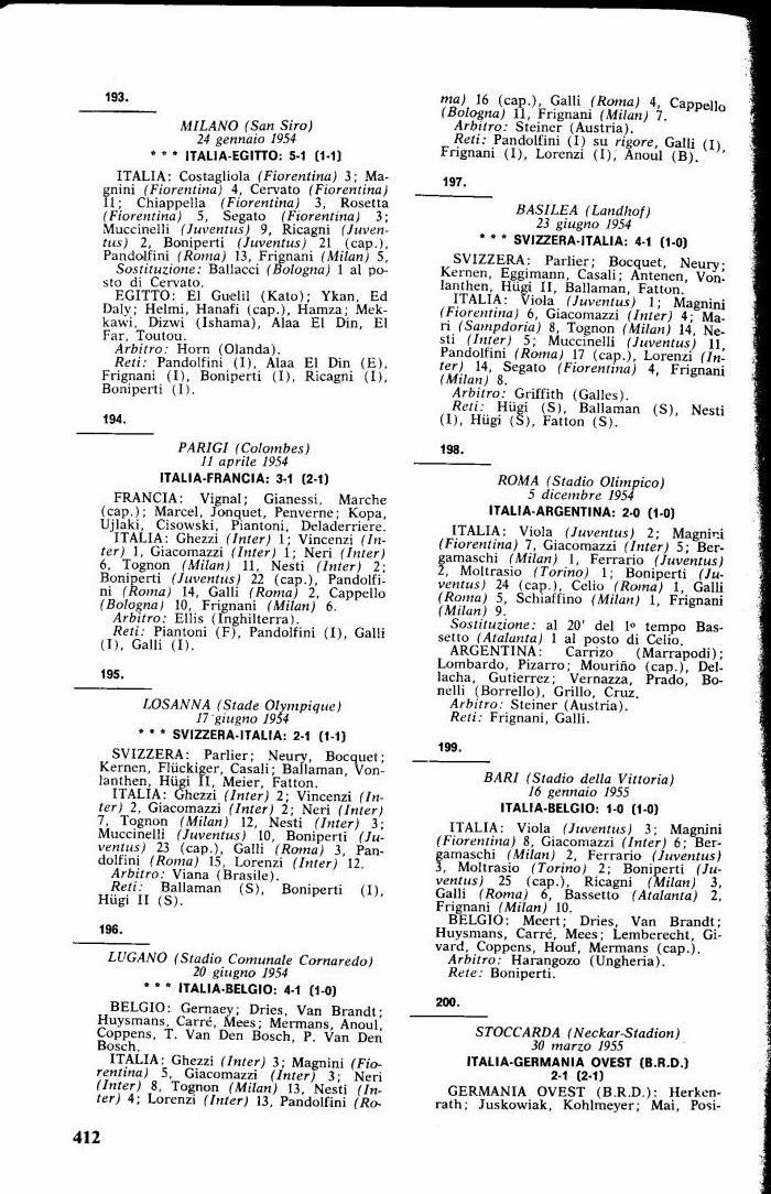ITALIA: Costagliela (Fiorentina) 3; Ma-gnini (Fiorentina) 4, Cervato (Fiorentina) II; Chiappella (Fiorentina) 3, Rosetta (Fiorentina) 5, Segato (Fiorentina) 3; Muccinelli (Juventus) 9, Ricagni (Juven-tus) 2, Boniperti (Juventus) 21 (cap.), Pandolfini (Roma) 13, Frignani (Milan) 5,