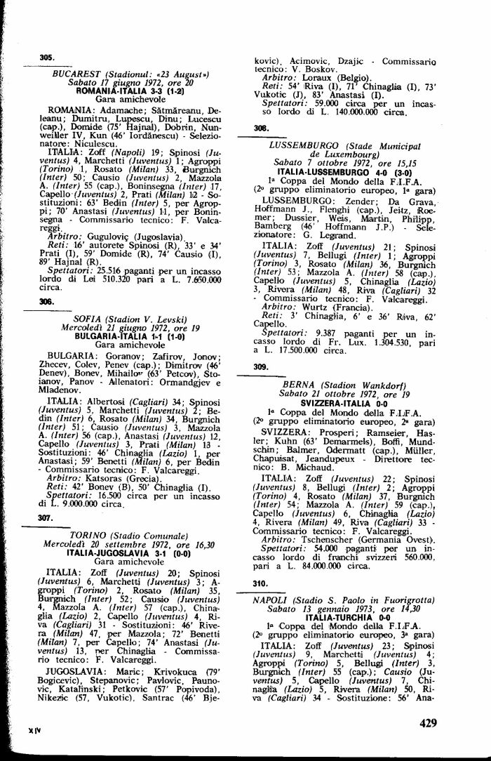 ITALIA: Zoff (Juventus) 21; Spinosi (Juventus) 7, Bellugi (Inter) 1; Agroppi (Torino) 3, Rosato (Milan) 36, Burgnich (Inter) 53; Mazzola A. (Inter) 58 (cap.), Capello (Juventus) 5, Chinaglia (Lazio) 3, Rivera (Milan) 48, Riva (Cagliari) 32 - Commissario tecnico: F. Valcareggi.