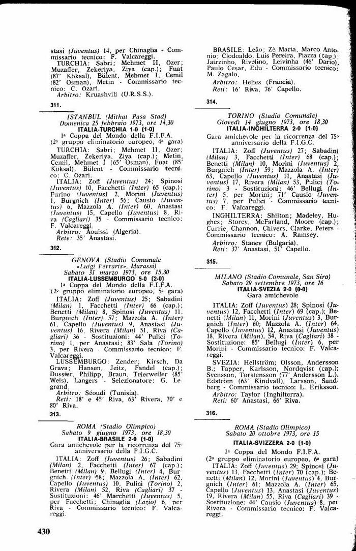 ITALIA: Zoff (Juventus) 29; Spinosi (Juventus) 13, Pacchetti (Inter) 70 (cap.); Benetti (Milan) 12, Morini (Juventus) 4, Burgnich (Inter) 61; Mazzola A. (Inter) 65, Capello (Juventus) 13, Anastasi (Juventus) 19, Rivera (Milan) 55, Riva (Cagliari) 39 -
