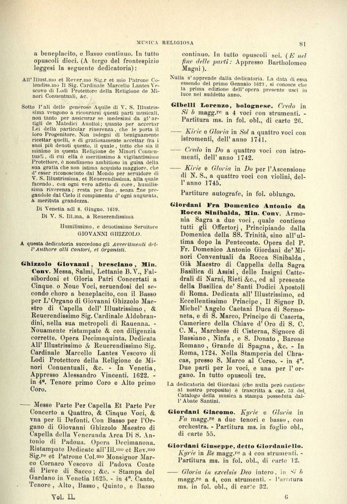 Ghizzolo Giovanili , bresciano , Min. Conv. Messa, Salmi, Lettanie B.Y., Fal-sibordoni et Gloria Patri Concertati a Cinque, o Noue Voci, gemendosi del secondo choro a beneplacito, con il Basso per L'Organo di Giovanni Ghizzolo Maestro di Capella dell' Illustrissimo, & Reuerendissimo Sig. Cardinale Aldobrandino nella sua metropoli di Rauenna. -Nouamentc ristampate & con diligenzia corrette. Opera Decimaquinta. Dedicata All' Illustrissimo & Reuerendissimo Sig. Cardinale Marcello Lantes Vescovo di Lodi Protettore della Religione do Minori Conuentuali, &c. - In Venetia, Appresso Alessandro Vincenti. 1622. -in 4°. Tenore primo Coro e Alto primo Coro.
