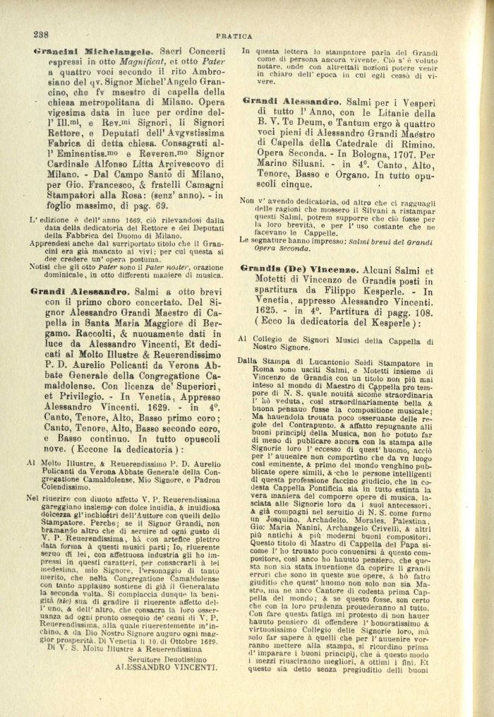 Grandi Alessandro. Salmi a otto brevi con il primo choro concertato. Del Signor Alessandro Grandi Maestro di Capella in Santa Maria Maggiore di Bergamo. Raccolti, & nuouamente dati in luce da Alessandro Vincenti, Et dedicati al Molto Illustre & Reuerendissimo P. D. Aurelio Policanti da Verona Abbate Generale delia Congregatione Ca-maldolense. Con licenza de' Superiori, et Privilegio. - In Venetia, Appresso Alessandro Vincenti. 1629. - in 4°. Canto, Tenore, Alto, Basso primo coro ; Canto, Tenore, Alto, Basso secondo coro, e Basso continuo. In tutto opuscoli nove. ( Eccone la dedicatoria ) :