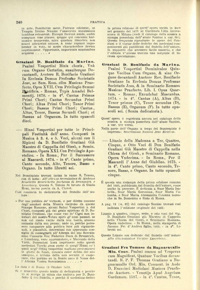Psalmi Vespertini Dominieales Quin-que Vocibus Cum Organo, & sine Organo decantanti Auctore Rev. Bonifacio Gratiano In Ecclesia Domus Professae Societatis .Testi, & in Seminario Romano Musicae Praefecto. Lib. T. Opus Quar-tum. - Romae, Excudebat Mascardus. 1(174. - in 4°. Cantus (A), Altus (B), Tenor primus (C), Tenor secundus (D), Bassus (E), Organum (F). In tutto opuscoli sei. ( Senza dedicatoria ).