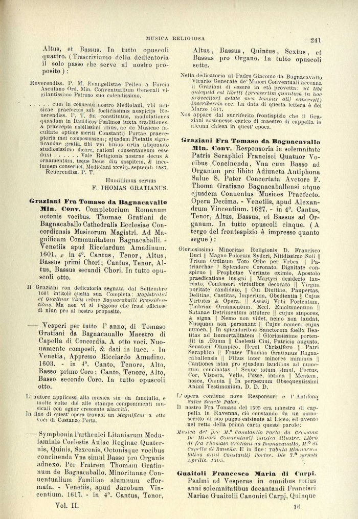 Graziali! Fra Tomaso (la Bagnacavallo Min. Conv. Responsoria in solemnitate Patris Seraphici Francisci Quatuor Vocibus Concinenda, Vna cum Basso ad Organum prò libito Adiuncta Antiphona Salue S. Pater Concertata Avctore F. Thoma Gradano Bagnacaballensi atque ejusdem Conuentus Musices Praefecto. Opera Decima. - Venetiis, apud Alexan-drum Vincentium. 1627. - in 4°. Cantus, Tenor, Altus, Bassus, et Bassus ad Organum. In tutto opuscoli cinque. ( A tergo del frontespizio è impresso quanto segue ) :