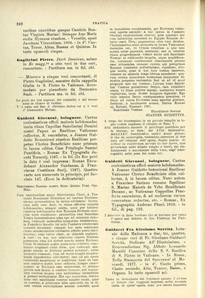 Guidetti Giovanni, bolognese. Cantus ecclesiasticus officii maioris liebdomadae iuxta ritum Capcllae Sanctiseimi Domini nostri Papae ac Basilicae Vaticanae collectu8, & emendatus, a Joanne Gui-detto Bononiensi eiusdem Basilicae perpetuo Clerico Beneficiato nunc primum in lucem editus. Cum Priuilegio Sumnii Pontificie. - Romae Ex Tipografia Jacobi Tornerij. 1587. - in fol. (In fine però la data è così impressa: Romae Exeu-debant Alexander Gardanus, & Fran-ciecue Coattinue Socij. 1587). Quattro carte non numerate in principio, poi facciate 147. (Ecco la dedicatoria):