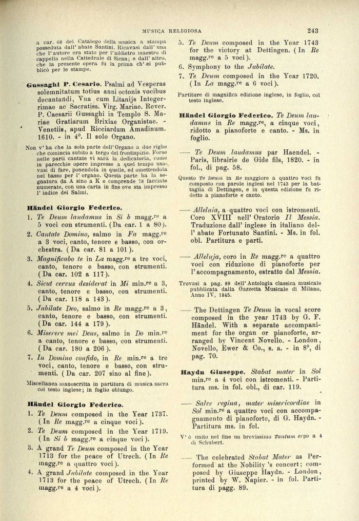— The Dettingen Te Deum in vocal score composed in the year 1743 by G. F. Handel. With a separate accompani-ment for the organ or pianoforte, ar-ranged by Vincent Novello. - London, Novello, Èwer & Co., s. a. - in 8°, di pag. 70.
