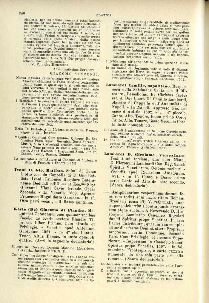 1 Religiosi e le persone di chiesa (segue a scrivere il Vincenzi) erano quelli che più degli altri comperavano le opere musicali che andava stampando queir editore. Comparisce anche qui la parola virtuoso applicata alla professione di stampatore di musica. Questo vocabolo assai più anticamente fu introdotto qual onorifico qualificativo dei musicisti.