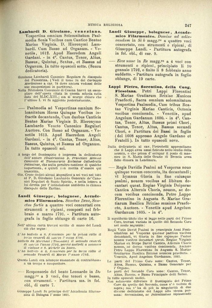 Lappi Pietro, fiorentino, della Cong. Fiesolana. Petri Lappi Fiorentini S. Mariae Gratiarum Brixiae Musices Praefecti, Sacra omnium solemnitatum Vespertina Psalmodia, Cum tribus Beatae Virginis Mariae Canticis, Octonis vocibus concinenda. - Venetiis, apud Angelum Gardanum 1600. - in 4°. Cantus, Tenor, Altus, Bassus primi Chori, Cantus, Tenor, Altus, Bassus secundi Chori, e Partitura dei Bassi in foglio (del 1608 appresso Angelo Gardano et Fratelli). In tutto opuscoli nove.