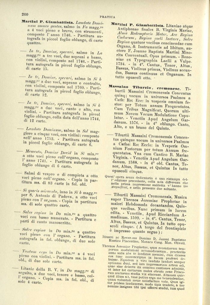 Martini P. Giambattista. Litaniae atque Antipbonae finales Ti. Virginis Marine, Alma Redemptoris Mater, Ave Regina Coelorum, Regina coeli laetare, Salve Regina quatuor vocibus concinendae cum Organo, & Instrumentis ad libitum, au-ctore F. Joanne Baptista Martini Minorità Conventuali. Opus primum. - Bono-niae ex Tvpograpliia Laelii a Yulpe-1734. - in' 4°. Cantus, Tenor, Altus, Bassus, Violinus primus, Violinus secun-dus, Bassus continuus et Organuin. In tutto opuscoli otto. ¦
