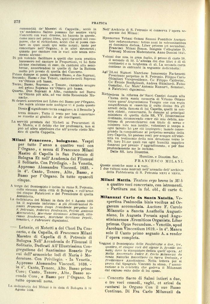 La dedicatoria del Milani in data del 0 Agosto 1635 ha il seguente indirizzo: a gli Illustrissimi si-Onori Francesco Cospi J'residente perpetuo in S. Petronio, Federico Fantuzzio, Fulvio Antonio Marescalchi, Marchese Girolamo Albergati, Ottaviano zambeccari, Marchese Girolamo pepoli, senatori, e Fabricieri dlgnlssimi.