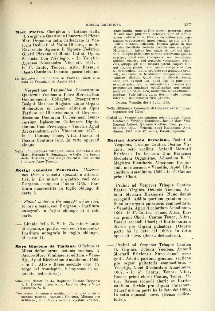 Mori Pietro. Compieta e Litanie della 1). Vergine a Quattro in Concerto di Pietro Mori Organista della Cattedrale di Volterra Dedicati al Molto Illustre, e molto Reverendo Signore II Signore Federico Ghetti Piovano di Monte Catini. Opera Seconda. Con Privilegio. - In Venetia, Apresso Alessandro Vincenti. 1641. -in 4'. Canto, Tenore, Alto, Basso, e Basso Continuo. In tutto opuscoli cinque.