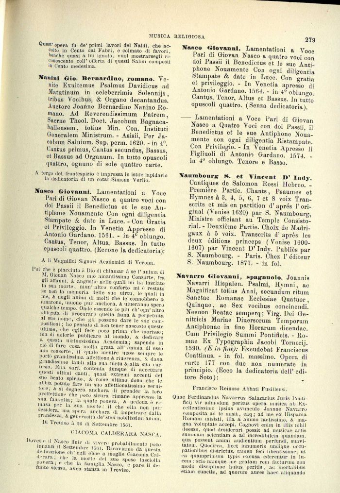 Navarro Giovanni, spagnuolo. Joannis Navarri Hispalen. Psalmi, Hymni, ac Magnificat totius Anni, secundum ritum Sanctae Romanae Ecclesiae Quatuor, Quinque, ac Sex vocibus concinendi. Neenon Beatae semperq; Virg. Dei Ge-nitricis Mariae Diuersorum Temporum Antiplionae in line Horaruin (licendac. Cum Privilegio Summi Pontificis. - Romae Ex Typographia Jacobi Tornerij. 1590. (E in fine): Excudebat Franciscus Coattinus. - in fol. massimo. Opera di carte 177 con duo non numerato in principio. (Ecco la dedicatoria dell' editore Soto):