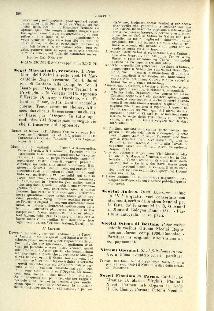 Come poi potesse il Negri esser Vice Maestro nella Ducale di S. Marco in Venezia, e servire la Cattedrale di Verona (come ne fa motto nella dedicatoria) non è facile a decifrarsi. Forse negli anni antecedenti tenea in Venezia il detto incarico, e nel 1613 passò ad altro impiego nel Duomo della sua patria.