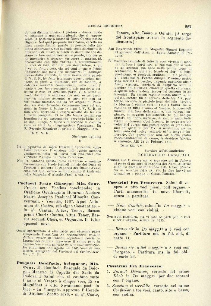 Pasquali Bonifacio, bolognese, Min. Conv. Di Bonifacio Pasquale da Bologna Maestro di Capella del Santo da Padova I Salmi che si cantano tutto P anno al Yespro à cinque voci, Et vn Magnificat à otto. Novamente posti in luce. - In Villeggia. Appresso 1' Ilerede di Girolamo Scotto 1576. - in 4°. Canto,