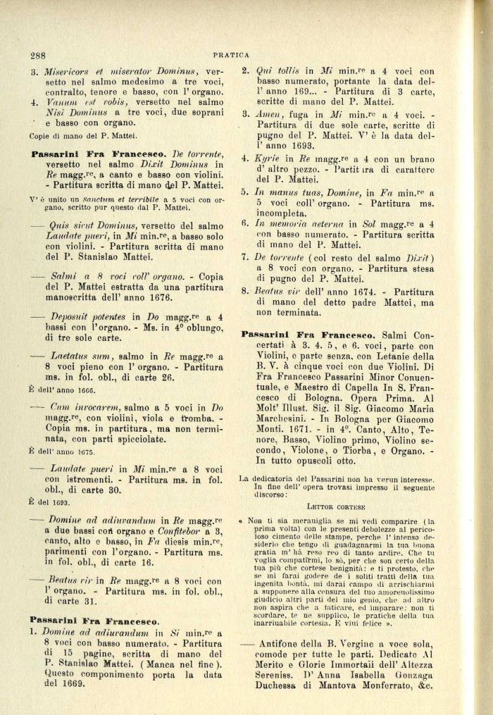 Passarini Fra Francesco. Salmi Concertati à 3. 4. 5, e 6. voci, parto con Violini, e parto senza, con Letanie della lì. V. à cinque voci con due Violini. Di Fra Francesco Passarini Minor Conuen-tuale, e Maestro di Capella In S. Francesco di Bologna. Opera Prima. Al Molt' Illust. Sig. il Sig. Giacomo Maria Marchesini. - In Bologna per Giacomo Monti. 1671. - in 4°. Canto, Alto, Tenore, Basso, Violino primo, Violino secondo, Violone, 0 Tiorba, e Organo. -In tutto opuscoli otto.