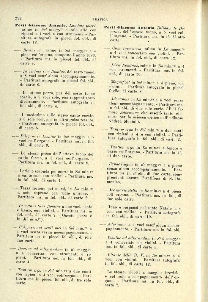 Perti Giacomo Antonio. Diligati1 te Domine, dell' ottavo tuono, a 5 voci col-1' organo. - Partitura ms. in 4°, di otto carte. .