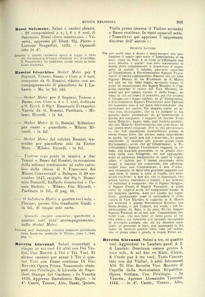 Tenori e Basso dal Rossini, in occasiono della solenne restituzione al culto cattolico della chiesa di S. Francesco dei Minori Conventuali a Bologna il 28 novembre 1847, eseguito dai Sig.ri Domenico Donzelli, Raffaele Gamberini e Cosare Badiali. - Milano, Gio. Ricordi. -Partitura in fol., di pag. 44.