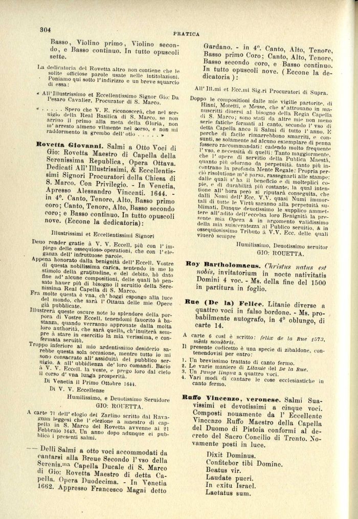 Rovetta Giovanni. Salmi a Otto Voci di Gio: Rovetta Maestro di Capella della Serenissima Republica, Opera Ottava. Dedicati All' Illustrissimi, & Eccellentissimi Signori Procuratori della Chiesa di S. Marco. Con Privilegio. - In Venetia, Apresso Alessandro Vincenti. 1644. -in 4°. Canto, Tenore, Alto, Basso primo coro; Canto, Tenore, Alto, Basso secondo coro; e Basso continuo. In tutto opuscoli nove. (Eccone la dedicatoria):