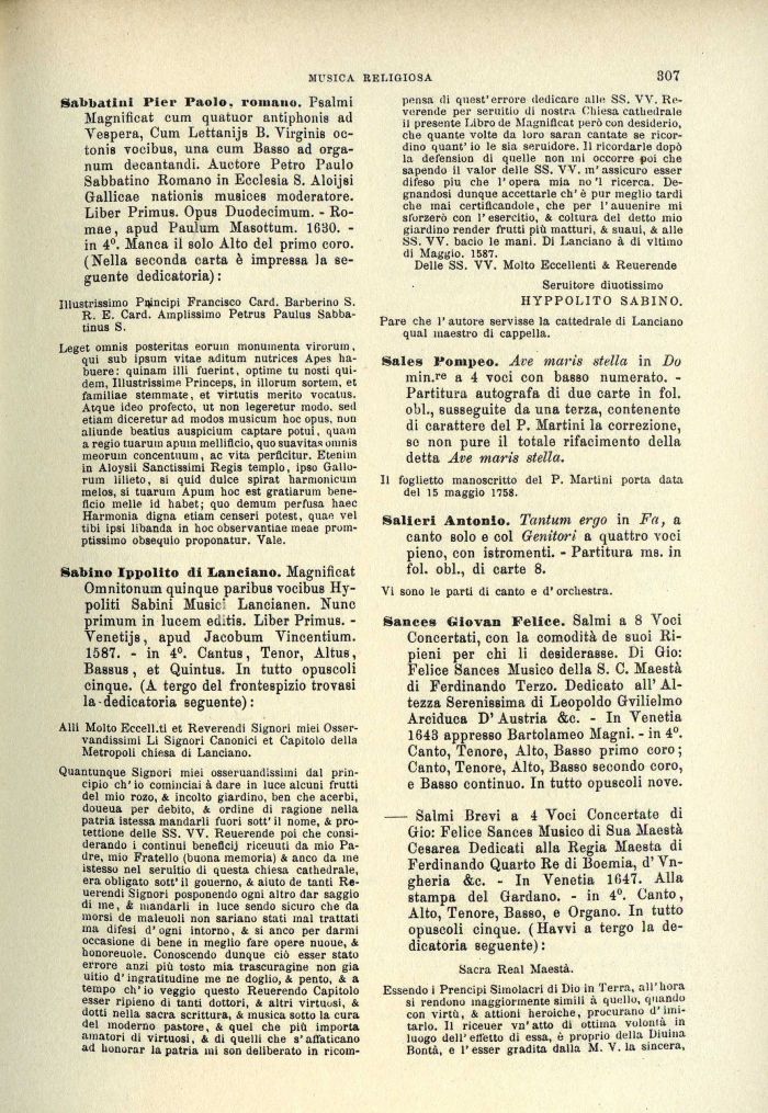 Sabino Ippolito di Lanciano. Magnificat Omnitonum quinque paribus vocibus Hy-politi Sabini Music' Lancianen. Nunc primum in lucem editis. Liber Primus. -Venetijs, apud Jacobum Vincentium. 1587. - in 4°. Cantus, Tenor, Altus, Bassus, et Quintus. In tutto opuscoli cinque. (A tergo del frontespizio trovasi la-dedicatoria seguente):