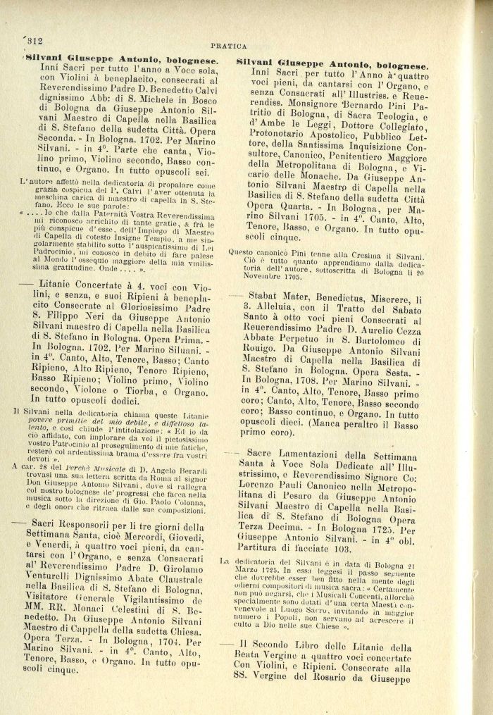 La dedicatoria del Silvani è in data di Bologna 21 Marzo 1725. In essa leggesi il passo seguente che dovrebbe esser ben Atto nella mente degli odierni compositori di musica sacra : « Certamente non può negarsi, che i Musicali Concenti, allorché specialmente sono dotati d'una certa Maest.i convenevole al Luogo Sacro, invitando in maggior numero i Popoli, non servano ad acrescere il culto a Dio nelle sue Chiese ».