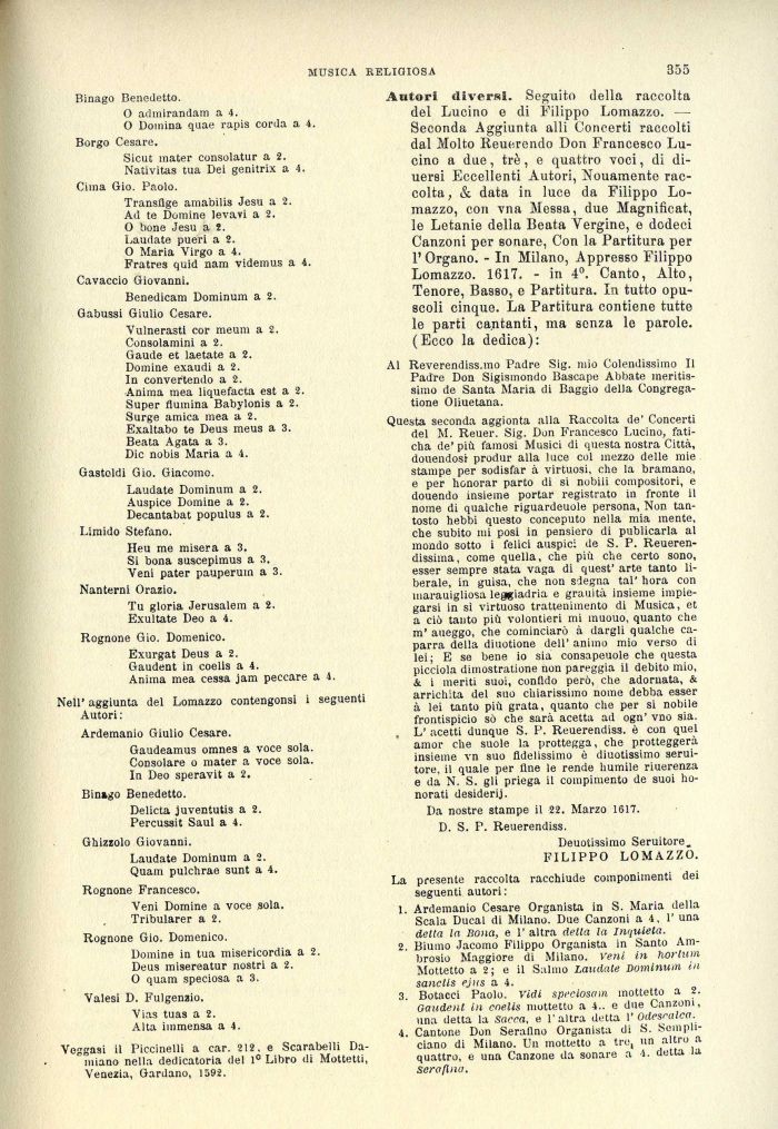 Autori diversi. Seguito della raccolta del Lucino e di Filippo Lomazzo. — Seconda Aggiunta alli Concerti raccolti dal Molto Keuerendo Don Francesco Lucino a due, tré, e quattro voci, di diuersi Eccellenti Autori, Nouamente raccolta, & data in luce da Filippo Lomazzo, con vna Messa, due Magnificat, le Letanie della Beata Vergine, e dodeci Canzoni per sonare, Con la Partitura per 1' Organo. - In Milano, Appresso Filippo Lomazzo. 1617. - in 4°. Canto, Alto, Tenore, Basso, e Partitura. In tutto opuscoli cinque. La Partitura contiene tutte le parti cantanti, ma senza le parole. (Ecco la dedica):
