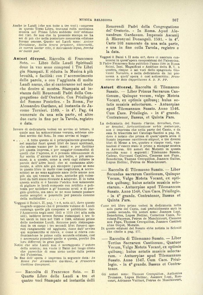 Autori diversi. Raccolta di Francesco Soto. — Libro delle Laudi Spirituali doue in vno sono compresi i Tre Libri già Stampati. E ridutta la Musica à più breuità, e facilità: con 1' accrescimento delle parole, e con l'aggiunta di molte Laudi nuoue, che si canteranno nel modo che dentro si mostra. Stampata ad instanza deìli Reuerendi Padri della Congregatione dell'Oratorio. Con Priuilegio de! Sommo Pontefice. - In Roma, Per Alessandro Gardano, ad instantia de Ja-como Tornieri. 1589. - in 4°. Pag. 64 numerate da una sola parte, ed altre due carte in fine per la Tavola, registro e data.