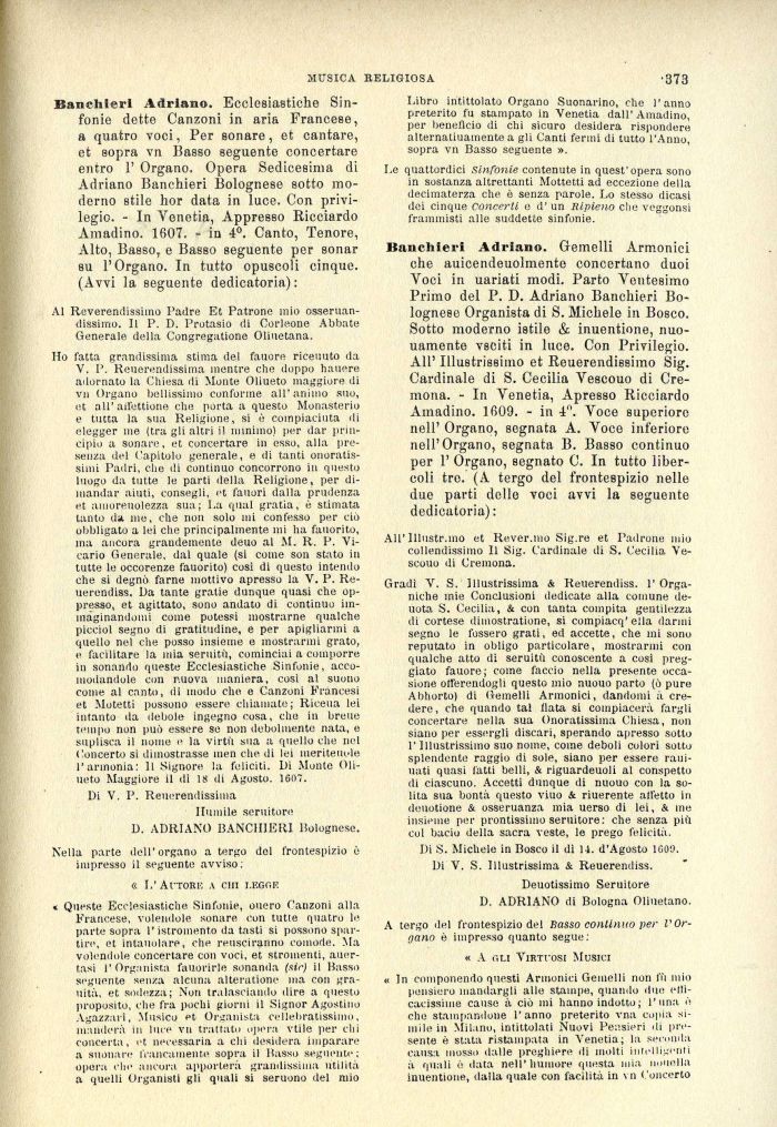 Banchieri Adriano. Ecclesiastiche Sinfonie dette Canzoni in aria Francese, a quatro voci, Per sonare, et cantare, et sopra vn Passo seguente concertare entro 1' Organo. Opera Sedicesima di Adriano Banchieri Bolognese sotto moderno stile hor data in luce. Con privilegio. - In Yenetia, Appresso Ricciardo Amadino. 1607. - in 4°. Canto, Tenore, Alto, Basso, e Basso seguente per sonar su l'Organo. In tutto opuscoli cinque. (Avvi la seguente dedicatoria):