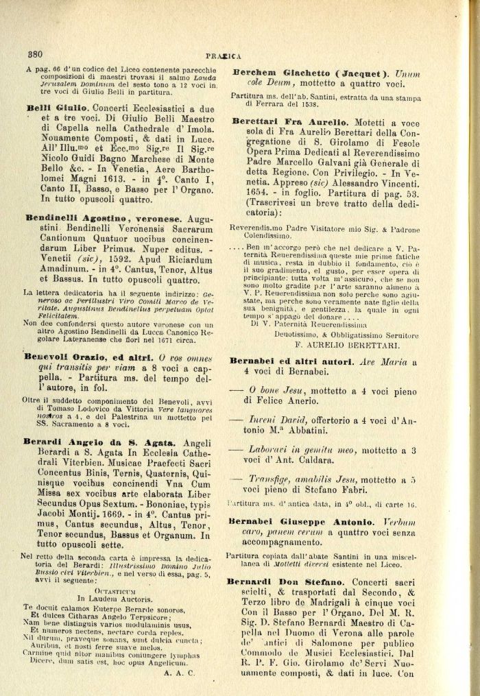 Berettari Fra Aurelio. Motetti a voce sola di Fra Aurelio Berettari della Con-gregatione di S. Girolamo di Fesole Opera Prima Dedicati al Reverendissimo Padre Marcello Galvani già Generale di detta Regione. Con Privilegio. - In Venetia. Appreso (sic) Alessandro Vincenti. 1654. - in foglio. Partitura di pag. 53. (Trascrivesi un breve tratto della dedicatoria) :